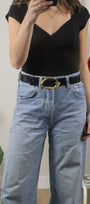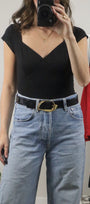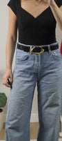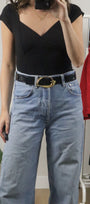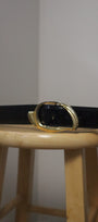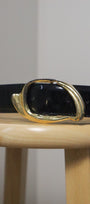 Size: Labeled L, suits M / Brand: Not listed / Condition: 8/10 (has wear on brass, see last two photos) / Material: Double Lined Leather / Type: Vintage / Colours: Black & Gold