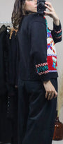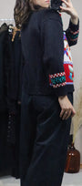 Size: Labeled M, suits S / Brand: Cleo / Condition: 8.5/10 (overall good shape, missing bottom button) / Material: 100% cotton / Type: Vintage / Colours: Black, teal, red, gold, blue, white