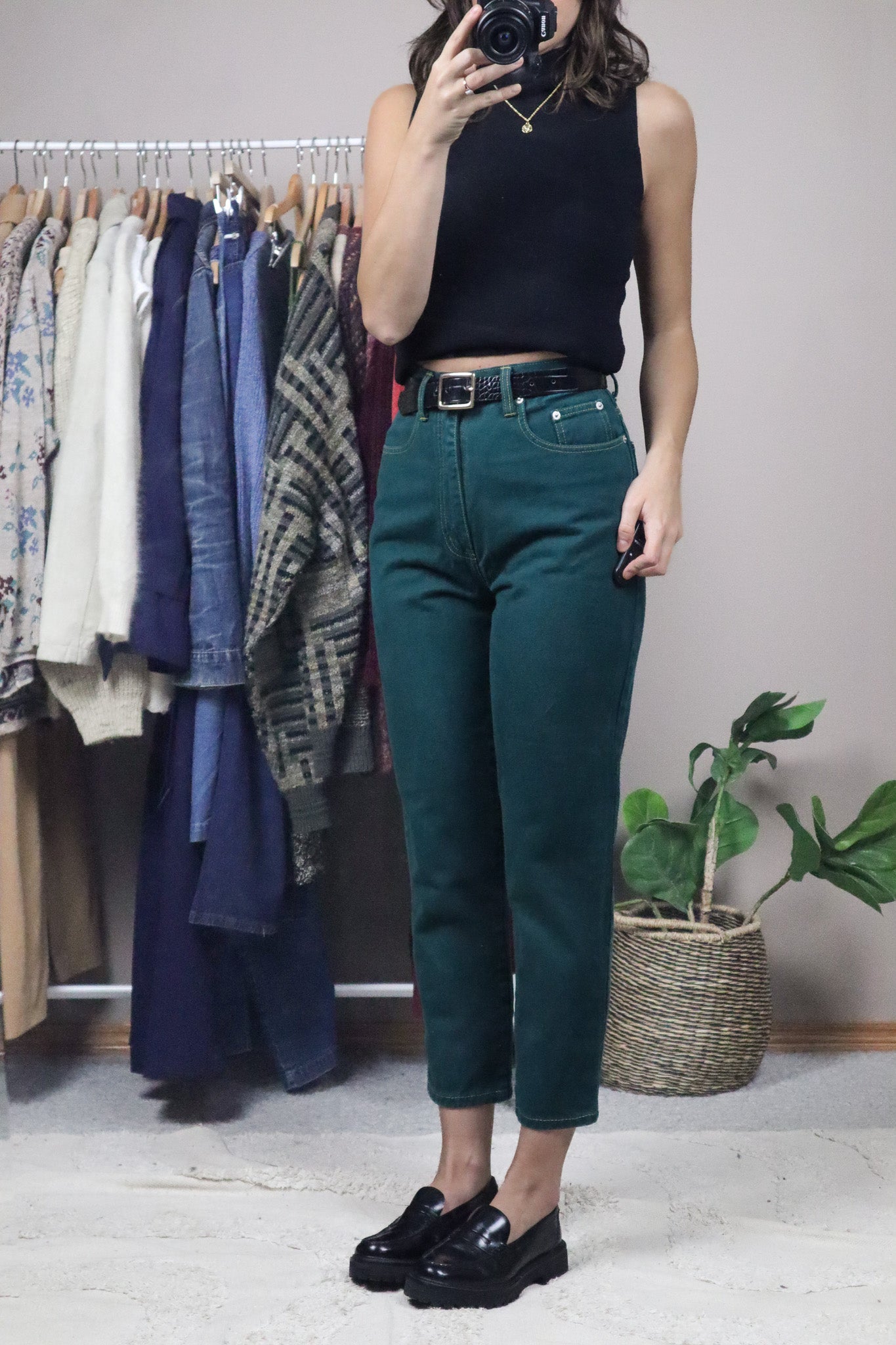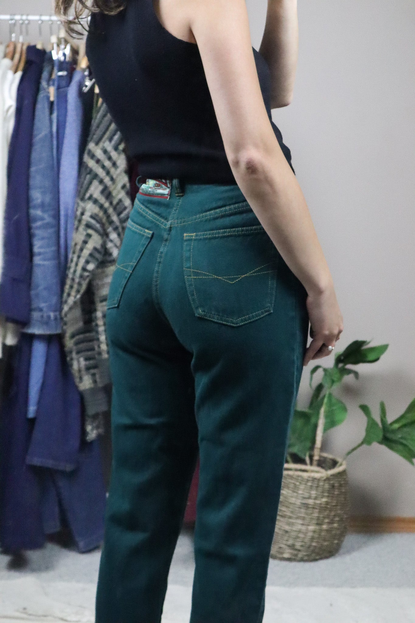 Size: Labeled 29, suits 25/26 / Brand: Pelican Cove / Condition: 9/10 / Material: 100% cotton / Type: Vintage / Colours: Emerald Green
