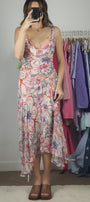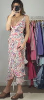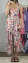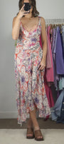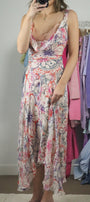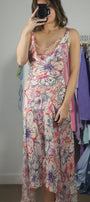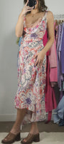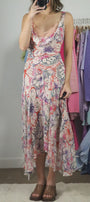 Size: Labeled 14, suits 10 / Brand: ile / Condition: 8/10 (has a few minor pulls in dress, very hard to notice) / Material: 100% silk (has beaded shoulders) / Type: Vintage / Colours: Off white, orange, blush, pink, purple