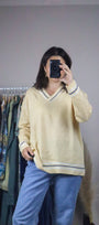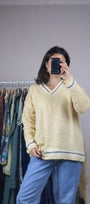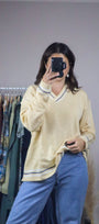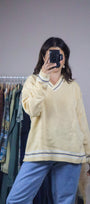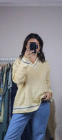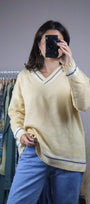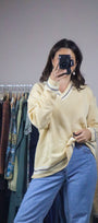 Size: Labeled 18, suits M/L / Brand: Jessica Sport / Condition: 9/10 / Material: 100% acrylic / Type: Vintage / Colours: Butter Yellow, navy, & white