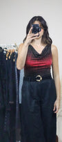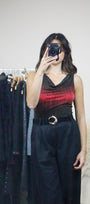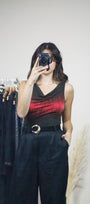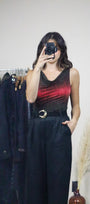 Size: Labeled M, suits S / Brand: Suzy Shier / Condition: 9/10 / Material: 80% polyester, 15% metallic, 5% spandex / Type: Vintage / Colours: Black, Red, Shimmer