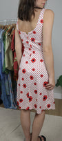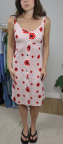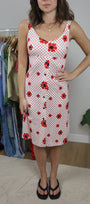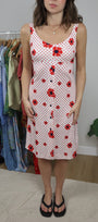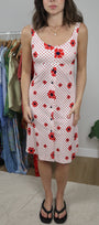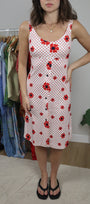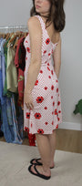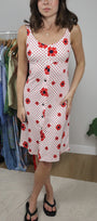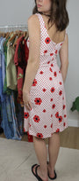 Size: Labeled 10, suits 4 / Brand: Sears / Condition: 8/10 (has a few snags/stains) / Material: 100% polyester / Type: Vintage / Colours: White & Red