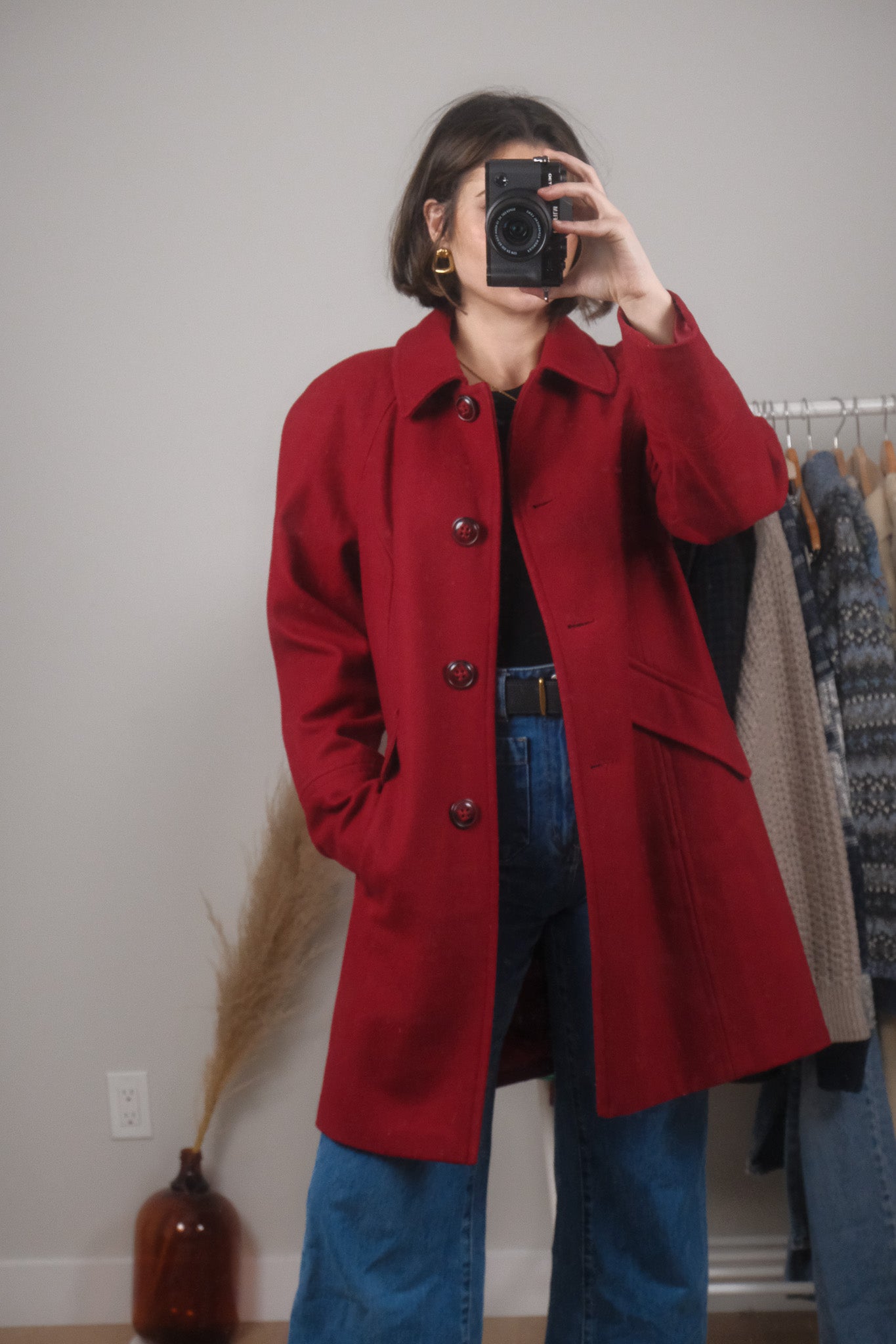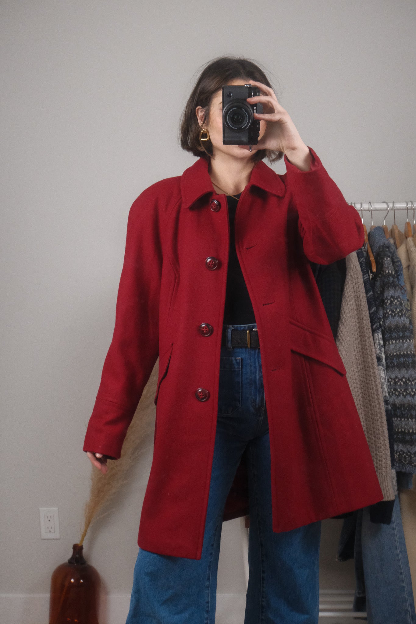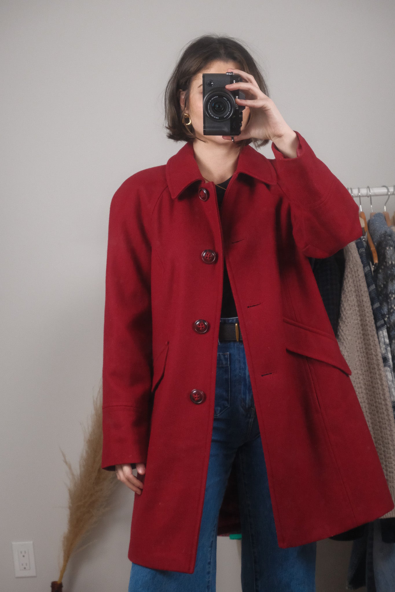 Size: Labeled M, suits M / Brand: London Fog / Condition: 9/10 / Material: 60% Wool, 30% polyester, 10% rayon / Type: Vintage / Colours: Red