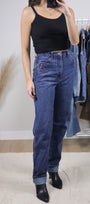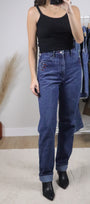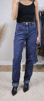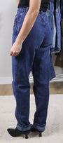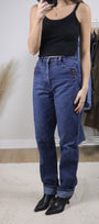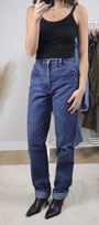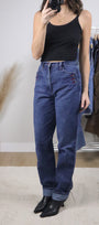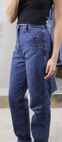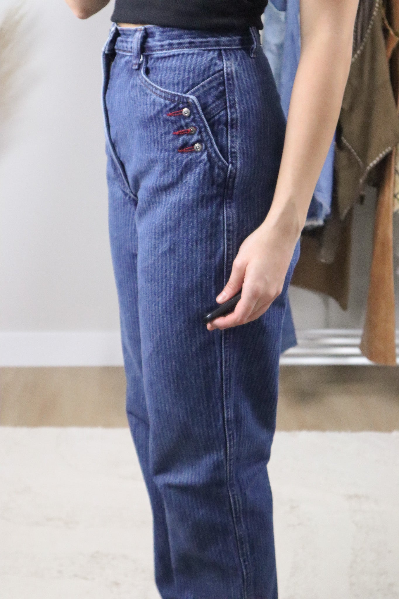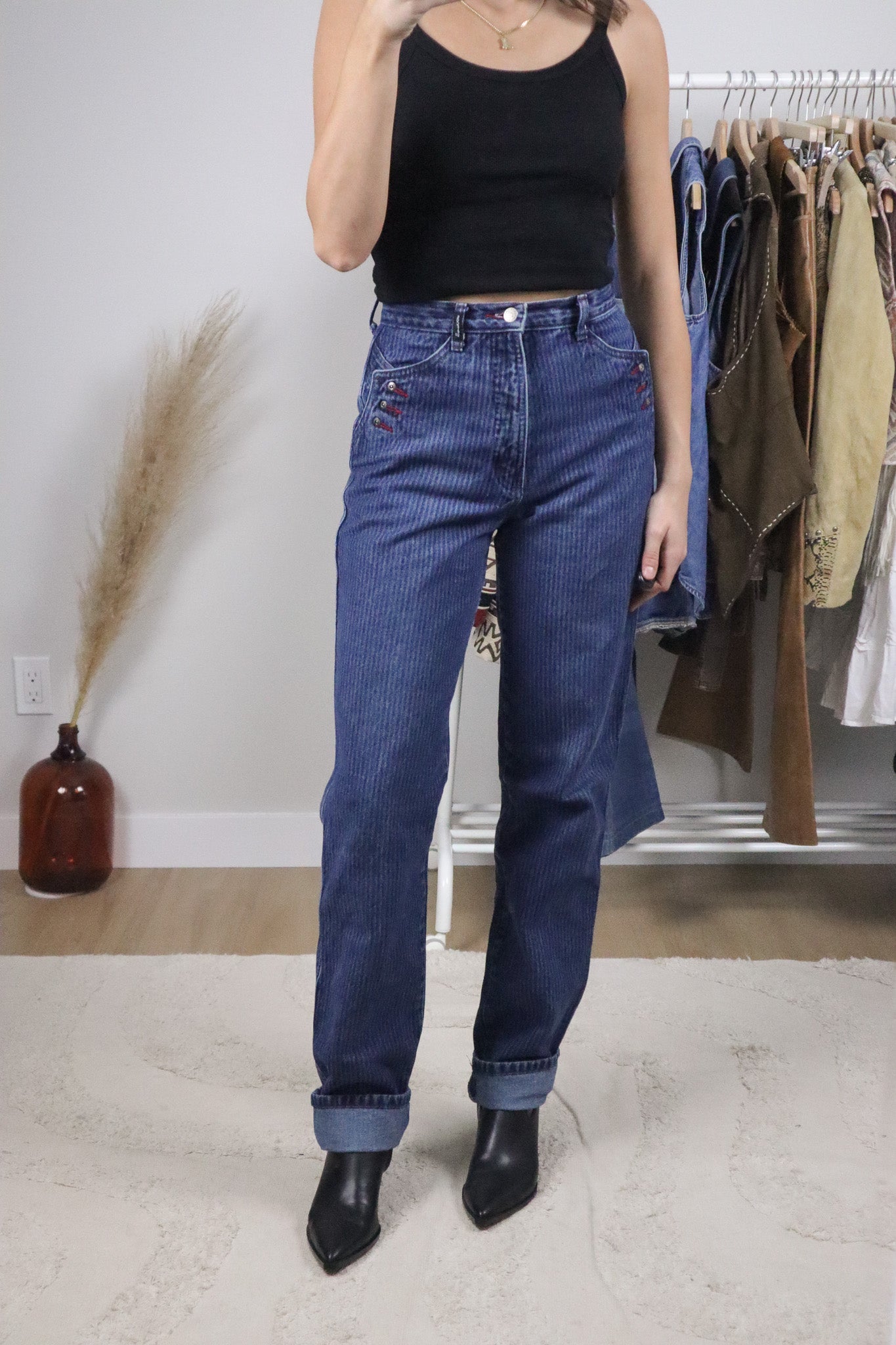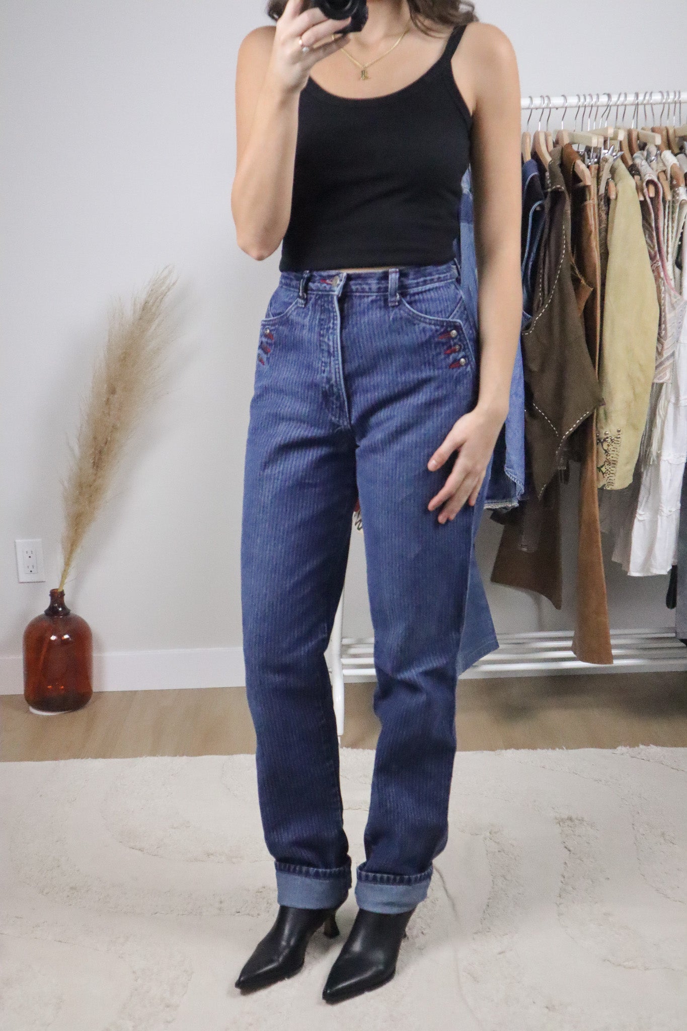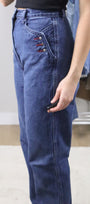 Size: Labeled 29, suits 26 / Brand: Rockies / Condition: 9/10 / Material: 100% cotton / Type: Vintage / Colours: Denim (red accents)