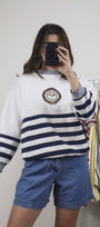 Size: Labeled S, suits S / Brand: Nordstrom Active Sports / Condition: 8/10 (minor hole near graphic) / Material: 80% cotton, 20% polyester / Type: Vintage / Colours: White, navy, gold, red