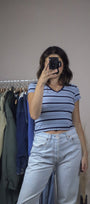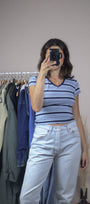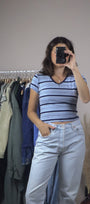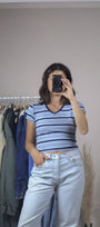 Size: Not labeled, suits S / Brand: R.E.A.L Clothes / Condition: 8.5/10 (has slight vintage wear) / Material: Not listed / Type: Vintage / Colours: Blue, white, navy