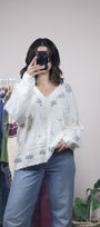Size: Labeled 2X, suits L/XL / Brand: Tag Cut Out / Condition: 9/10 / Material: 55% ramie, 45% cotton / Type: Vintage / Colours: Cream, pink, green, purple